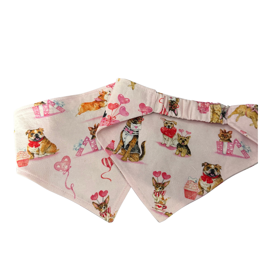 Dress your pup in effortless Valentine’s Day charm with our Scrunchie Dog Bandana in Valentine. This adorable accessory slips on like a dream thanks to its stretchy scrunchie-style neck—no tying, no Velcro, just comfort and cuteness in one simple motion.